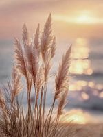 De pampagrassen staan als fijne silhouetten in de gouden schemering; elegant, kalm, bijna eerbiedig. De ondergaande zon hult de lucht en de zee in een sluier van licht en warmte. De grassen vangen de gloed, alsof ze het laatste licht van de dag vasthouden. Deze foto is pure poëzie: een compositie van gratie, natuur en zachte melancholie. Het is perfect voor kamers met een meditatieve, kalme uitstraling - een kunstwerk dat ontroert en rust brengt.