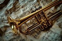 Een glanzend, gouden instrument rust harmonieus op een bed van nostalgische bladmuziek. De filigraan details van de ventielen en de zachte glans van de trompet stralen een tijdloze elegantie uit. In deze compositie lijken melodieën uit lang vervlogen tijden zacht door de lucht te dansen terwijl de muziek tot leven komt.