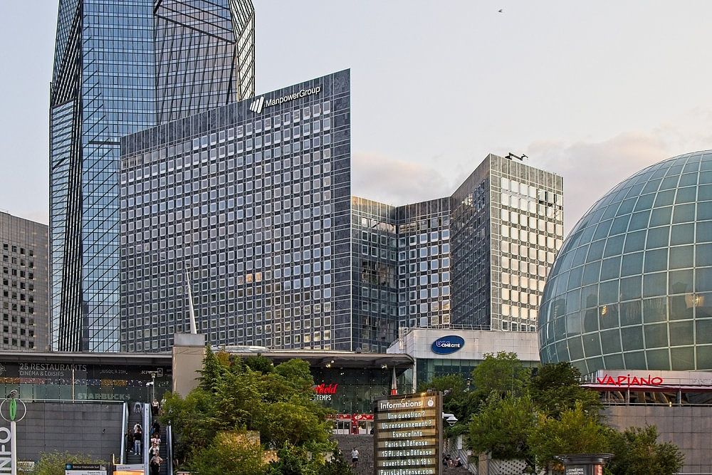 Zonsondergang op het centrale plein in het moderne zakencentrum La Defense in Courbevoie (Parijs).
