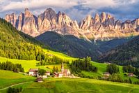 Gouden uur in de Villnöss vallei in Zuid-Tirol. Uitzicht op de spectaculaire Geisler toppen in de Dolomieten.