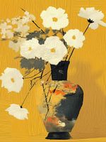 Witte bloemen in een kleurrijke vaas tegen een warme gele achtergrond, een mix van moderne en traditionele bloemsierkunst.