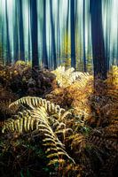 De door de zon uitgedroogde varens in het Meerdaalbos vormen een prachtige decoratie tussen de grote statige dennenbomen.