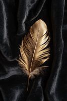 Dit elegante ontwerp toont een delicate veer bedekt met een prachtige gouden laag, die rust op een fluweelachtige donkere ondergrond. Het gouden oppervlak vangt het licht op een manier die diepte en verfijning aan de compositie geeft, terwijl de zachte textuur van de ondergrond een vleugje mysterie toevoegt. Deze afbeelding straalt luxe en eenvoud uit en past perfect bij moderne interieurs of kunstliefhebbers die houden van minimalistische elegantie. Ideaal als kunstwerk in een slaapkamer of hal, en perfect om een subtiele, luxueuze sfeer toe te voegen aan elke ruimte.