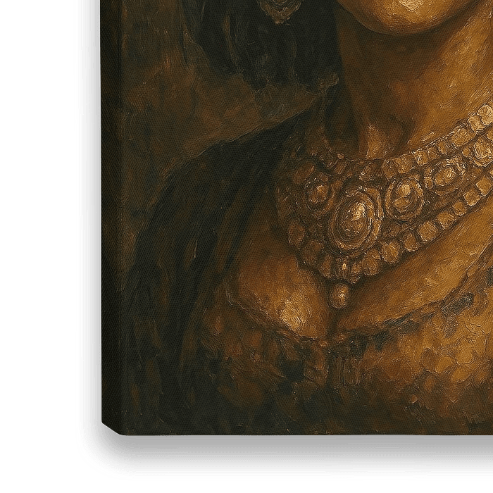 Dit schilderij toont een vorstin met een intense, zelfbewuste blik. Haar ogen, zwaar omlijst met zwarte eyeliner, trekken je direct naar binnen. De gouden sieraden, rijk aan detail, glinsteren subtiel tegen de warme, okergele achtergrond. Kijk naar de lichtval op haar jukbeenderen, of de verfstreken in haar gewaad: ruig maar verfijnd.…