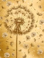De gedetailleerde, bijna grafische weergave van de paardenbloem en haar zaadjes komt prachtig tot zijn recht tegen een rijke, goudkleurige achtergrond met subtiele textuur en fonkelende lichtpuntjes, wat een magische sfeer creëert.