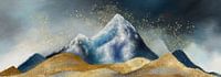 Een serene bergketen is afgebeeld met pieken die worden geaccentueerd door blauwe tinten en wervelingen, onder een hemel vol zwarte tinten en gouden spikkels. Gouden accenten zijn over het hele stuk verspreid, waardoor het een gevoel van luxe en betovering geeft.