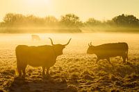 Ik ben dol op deze morgens met mistige zonsopkomsten boven bevroren velden. Schotse hooglanders lopen langzaam grazend door de mist. De mist kleurt geel tot oranje in tegenlicht tijdens de zonsopkomst.