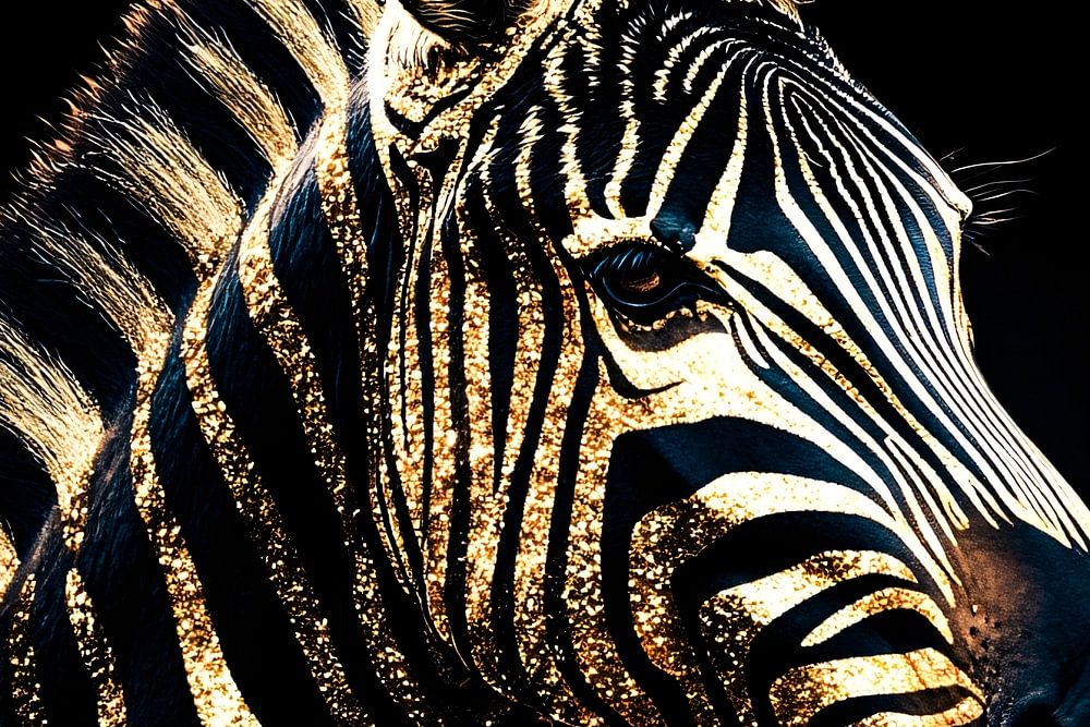 Dit indrukwekkende ontwerp van een zebra met een unieke mix van gouden details en scherpe contrasten brengt een luxe en eigentijdse uitstraling in je interieur. Perfect voor liefhebbers van kunst met een moderne en unieke twist. Dit kunstwerk is zowel een eyecatcher als een stijlvol statementstuk, geschikt voor verschillende ruimtes zoals de woonkamer, eetkamer of kantoor. De monochrome kleuren in combinatie met de gouden accenten zorgen voor een elegant en tijdloos effect, waardoor dit ontwerp harmonieus in vrijwel elke inrichting past. Een perfecte keuze voor wie wil genieten van de schoonheid van dieren in kunst met een moderne, artistieke interpretatie.