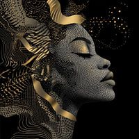 abstract en dynamisch portret van een vrouw, waarbij patronen en texturen een prominente rol spelen. Haar gezicht is gestileerd met een fijne stippenstructuur, terwijl golvende lijnen en gouden accenten haar haar en omgeving vullen. De donkere achtergrond laat de gouden en zwarte elementen schitteren, wat een dramatisch en luxueus…