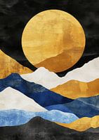 Dompel jezelf onder in de wereld van deze moderne en minimalistische illustratie, die een gouden zon laat zien boven een gestileerd berglandschap. De kleurrijke compositie in blauw en goud tegen de diepzwarte achtergrond creëert een fascinerend contrast. De aquareltechniek geeft de afbeelding een bijzondere lichtheid en levendigheid.