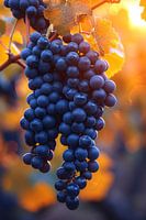 Dompel jezelf onder in de warme gloed van de ondergaande zon, terwijl deze een rijke oogst druiven verlicht. Elke druif glinstert als een kostbaar juweel, een belofte van de heerlijke wijn die komen gaat. De bladeren, getooid in herfsttinten, vormen een prachtig contrast met de diepblauwe trossen. Dit kunstwerk brengt de rustieke schoonheid van de wijngaard rechtstreeks in jouw huis, een herinnering aan de eenvoudige geneugten van het leven.