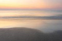 Een foto gemaakt tijdens een zachte zonsondergang met pastel tinten in de lucht. De kalme zee geeft een fijne sfeer. Gefotografeerd op Ameland, een van de mooie waddeneilanden.