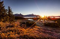De zon gaat net naast het Dachsteinmassief op en werpt de eerste stralen over het water van de Schwarze Lacke en bosbessenstruiken op de Gerzkopf.