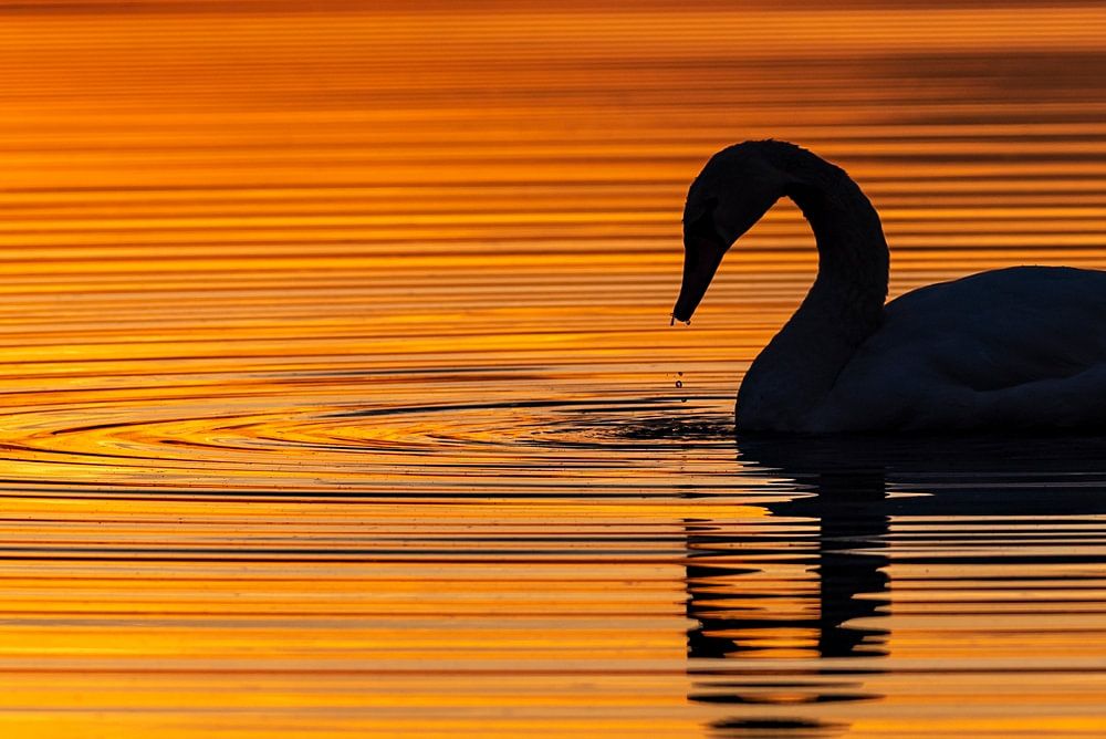 Met een prachtige zonsopkomst is deze zwaan bezig met het ontbijt.