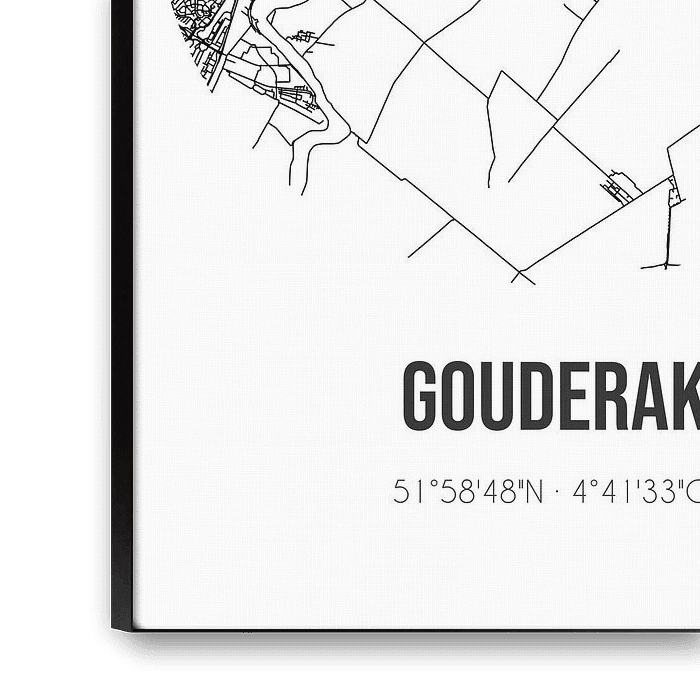 Zwart-witte landkaart, stratenplan of plattegrond van Gouderak. Gouderak is gelegen in de gemeente Krimpenerwaard, provincie Zuid-Holland. Op de stadskaart zijn alle openbare wegen in Gouderak opgenomen. Verder is de kaart voorzien van de coördinaten van het centrum van Gouderak.