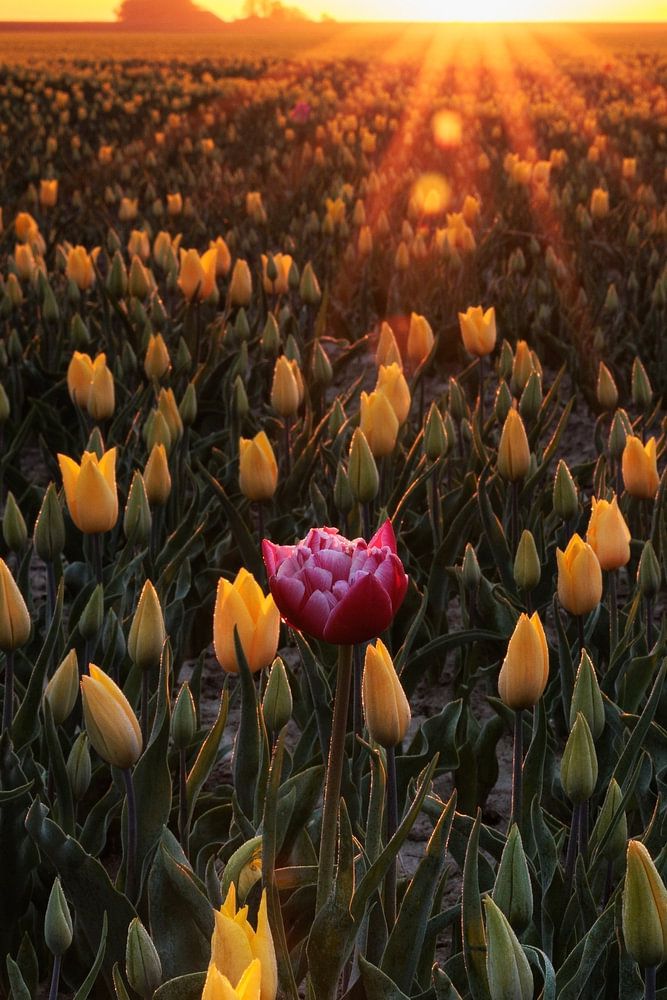 De roze tulp prijkt als vreemde eend in de bijt boven alle gele tulpen uit. De goudgele zonsopkomst zet de tulp nog eens extra in het zonlicht.