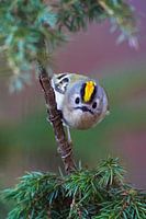 Goudhaantje (Regulus regulus) die recht de camera in kijkt.
