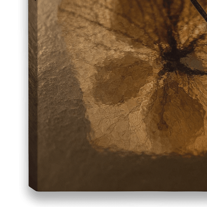 "Goudkleurig stilleven met bloemen: Het hortensiablaadje in het licht" is een macrofoto van een blaadje van de hortensia die al deels vergaan is, waardoor je prachtig de nervenstructuur kan zien van het blad. Als je inzoomt op het werk zie je