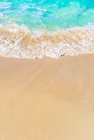 Gouden gekleurde zandige strandachtergrondtextuur met zacht schuimende overzeese watergolf en ruimte