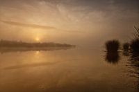 Met mist boven het water zie je toch de zon opkomen in een goudkleurige omgeving.