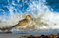 Goudplevier (Pluvialis apricaria) staand op het strand van Helgoland (Duitsland) met brekende golven op achtergrond.