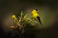 Een geel met zwarte vogel zittend op een tak met een prachtig donkere groene achtergrond. De goudsijs, ook wel Amerikaanse goudvink, is een zangvogel uit het geslacht Spinus in de familie van vinkachtigen. De foto is digitaal verwerkt tot een realistisch geschilderd kunstwerk.