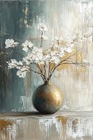 Goudvaas | Whisper of Gold - Dit bloemen schilderij toont een weelderige vaas in goudtinten met een uitbundig boeket van witte bloesems, tegen een achtergrond met subtiele textuur en vegen van grijze en gouden verf.