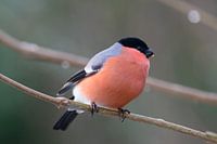 Het mannetje van de Goudvink. Zo bescheiden is zijn zang en roep. Des te uitbundiger is zijn kleur. Vaak hoog in een Berk op zoek naar zaadjes. Maar nu heel dichtbij.
