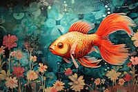 Details: goudvis, bloemen, turquoise, oranje, blauw, groen, aquatisch, natuur, schilderij, dynamisch, Warm glow