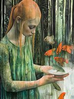 In een rustige bosomgeving staat een zachtaardig jong meisje met een delicaat bord in haar hand met een kleine vis. Het sprookjesachtige tafereel komt tot leven met levendige oranje en groene tinten, terwijl speelse vissen om haar heen zwemmen en een gevoel van verwondering en verbondenheid met de natuur creëren. De sierlijke details…