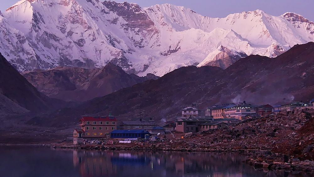 Sherpa dorp Gokyo in de Himalya in Nepal met de met ijs bedekte top van Cho Oyu (8.188 m) en het derde Goyko meer bij zonsondergang.