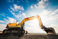 Grote graafmachine op een bouwplaats met de zon op de achtergrond