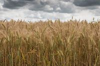 Goudgeel graan, voedsel dat wereldwijd wordt gegeten. Graan is de verzamelnaam voor de zaden van grassen, rijst, tarwe, gerst, rogge, maïs, haver, gierst en spelt. Dit veld met graan lag in het Brabantse land, tussen Hank en Nieuwendijk, vlak bij Nationaal Park De Biesbosch in Nederland.