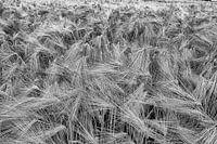 Een detail van een groot veld met gerst. Gerst is vrij makkelijk te herkennen aan de lange haren aan de aren.