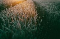 Een graanveld bestreken met het laatste licht van de ondergaande avondzon. Sfeervolle avond op de agrarische velden van nederland met gewassen de bijna klaar zijn aan het einde van de zomer om geoogst te worden. Mooie sfeervolle print voor op kantoor of als aanvulling op je interieur in een moody look