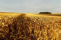 Gouden graanveld bij droog weer, de schaduw van een boom leidt de blik in de diepte, klein bos op de achtergrond - Ligging: Duitsland