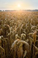 Een landschapsfoto van een graanveld tijdens zonsondergang om de gouden kleur van het graan nog wat meer te benadrukken. Een mooie foto van een akker vol goud geel graan.