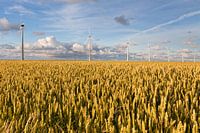 Graanvelden in de Eemspolder een half uur voor zonsondergang, vlakbij de Noordkaap van Nederland en de Eemshaven. Op de achtergrond een rij windmolens.