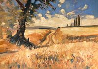 Het goudgele graan nabij de Eyser Plantage te Eys-Wittem (Zuid-Limburg) staat klaar voor de oogst. Het glooiende Heuvelland waar ik opgroeide en leerde schilderen in de open lucht. Een landweggetje met een Europeese zomereik op de hoek compleet met veldkruis. Een dromerig landschap waarbij ik nooit precies wist hoe het dal aan de andere zijde van de heuvel eruit zou zien. Pure romantiek, het verlangen naar daar waar je niet bent.