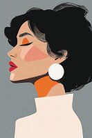 Een stijlvol minimalistisch portret in zijaanzicht dat de essentie van vintage glamour vangt in een modern jasje. De illustratie toont een elegante compositie met kenmerkende elementen: een dramatische korte coupe, een statement oorbel en een gedurfde oranje accent tegen een ingetogen grijze achtergrond. De zachte lijnen en het kleurgebruik creëren een tijdloze sfeer die zowel retro als hedendaags aanvoelt.