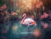 Een betoverend fine art beeld van een sierlijke flamingo die in het water staat, omringd door een dromerige omgeving van kleurrijke bloemen en zachte bokeh. De delicate schoonheid en elegantie van de flamingo worden prachtig vastgelegd in dit beeld, dat een gevoel van rust en sereniteit uitstraalt.