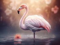 Een betoverend fine art beeld van een sierlijke flamingo die in het water staat, omringd door een dromerige omgeving van kleurrijke bloemen en zachte bokeh. De delicate schoonheid en elegantie van de flamingo worden prachtig vastgelegd in dit beeld, dat een gevoel van rust en sereniteit uitstraalt.