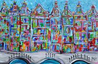 Blauwe kleurrijke grachtengordel met herenhuizen .Een expressief schilderij met als combinatie figuratief met abstracte kunst .Het kunstwerk weerspiegelde de sfeer van Nederland en haar bekende oer oud Hollandse steden zoals Amsterdam Alkmaar met hun prachtige geveltjes en voorgevingen en bijzondere bouwelementen .Geschilderd en weergegeven in frisse blauwe kleurtinten .