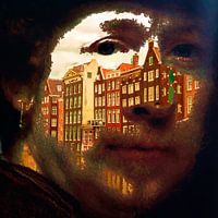 Een schilderachtig digitaal portret waarin Rembrandts gezicht vervloeit met de golvende gevels van Amsterdamse grachtenhuizen. De combinatie van bewerking in Photoshop en verfachtige penseelstreken in Corel Painter X3 geeft het beeld een dromerige, nostalgische uitstraling. De historische gevels en zijn gelaat worden één, als symbool van de verwevenheid van stadsgeschiedenis en identiteit. De digitale lagen roepen tegelijkertijd een moderne, diepzinnige sfeer op en benadrukken de weerspiegeling tussen verleden en heden.