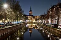 Sfeervolle avondopname van de gracht aan de Toussaintkade in Den Haag met uitzicht op de Grote Kerk in het centrum van Den Haag.
