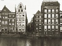 Een bewerking van een oude zwart wit foto van George Henrik Breitner van grachtenpanden aan het Damrak in Amsterdam. Op de voorgrond is het water van het Damrak zichtbaar met een zeilschip aan de kade. In het midden kijk je de Oudehandsteeg in richting de Warmoesstraat.