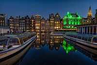 Grachtenpanden in Amsterdam, spiegelend in het water langs het Damrak, met de rondvaartboten opmeen rij. Foto genomen tijdens blauwe uurtje.