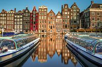 Een beeld van de Damrak te Amsterdam. Een uitzicht op grachtenpanden, de grachtengordel en boten, een herkenbaar Hollands beeld van Amsterdam. Het zonlicht tijdens het gouden uur zorgt voor een prachtig warm beeld.