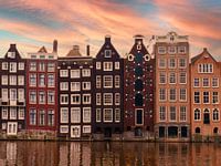 Deze sfeervolle foto heb ik gemaakt vlakbij de Beurs van Berlage op de Dam in Amsterdam. Te zien zijn de gevels van de grachtenpanden die direct aan het water gelegen zijn. Een paar panden zijn vanwege ouderdom deels verzakt, waardoor de kozijnen niet meer helemaal recht zijn.