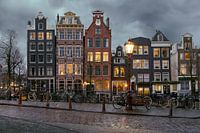 Een aantal grachtenpanden in de grachtengordel van Amsterdam tijdens een regenachtige en bewolkte dag